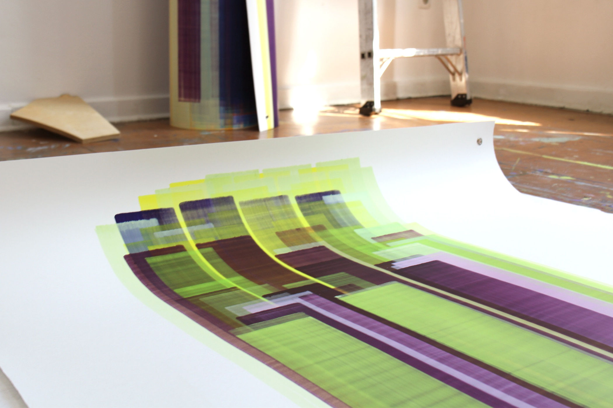Sonneck rolled out some of her latest Scrollpaintings on the floor. Neat, broad stripes of paint in bright yellows and greens and rich purples and blues overlap and interact on the paper. As a masterful colorist, Sonneck’s ultimate passion is color. Her artistic preoccupation with the instability of physical qualities begins with color. “When you layer colors, in principle, you end up with more colors than you apply. The rate of new color variations is "exploding" during the painting process.” Sonneck analogizes color relations to how humans are shaped by their relationships and environments, “an infinite range of feelings and reactions are possible.”